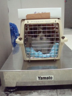 量りに乗っているところです。(上の箱の中にはフードなどが入っています)